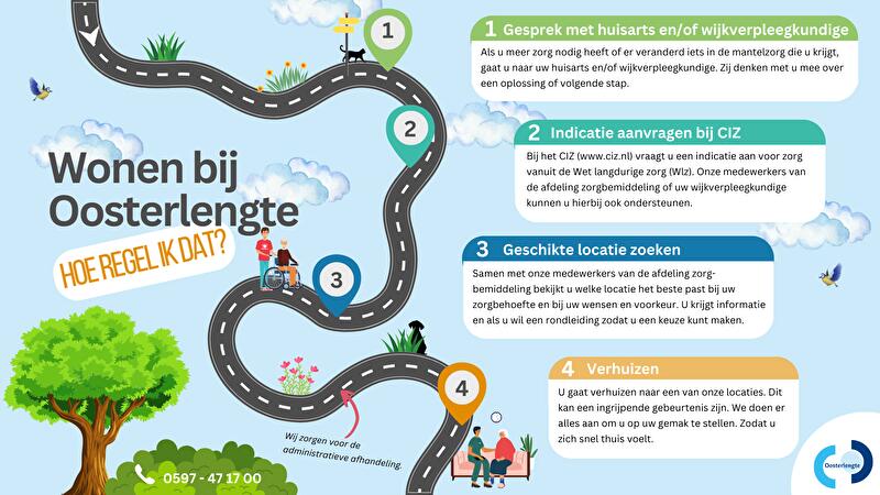 Wanneer u bij Oosterlengte gaat wonen moeten er een aantal zaken geregeld worden. U begint met het aanvragen van een indicatie. Wij helpen u graag bij de stappen die nodig zijn om bij Oosterlengte te komen wonen. Die stappen hebben we overzichtelijk voor u in beeld gebracht. U kunt de afbeelding hieronder downloaden als PDF.